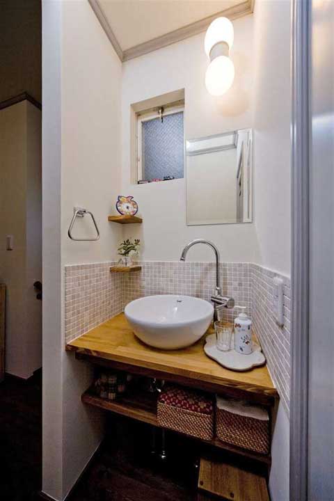 浴室外的洗手间同样充满欧式情调,圆形的洗手盆给人可爱的感觉,墙角小巧的木隔板放置小摆设和小盆栽,很别出心裁。