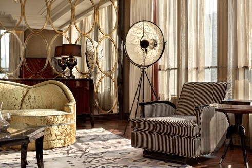 主题空间内的每件家具摆饰都十分考究,运用深色的场域氛围作为基础表情,透过金色、银色、漆器面点缀出奢华质感。