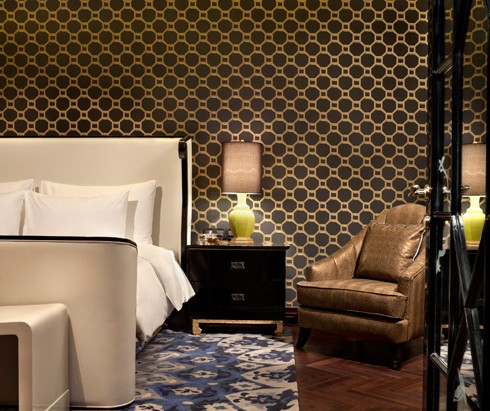利用古代窗花图腾意象作为壁纸素材,同时床组选用木质漆面搭配白色绷布,营造出独具个人魅力的高雅与大器。