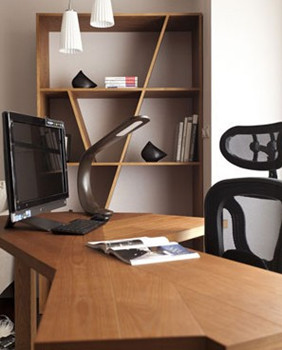 书架不规则的线条,巧妙呼应充满几何变化的木质书桌,化解书房的枯燥乏味感。