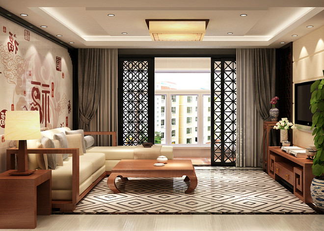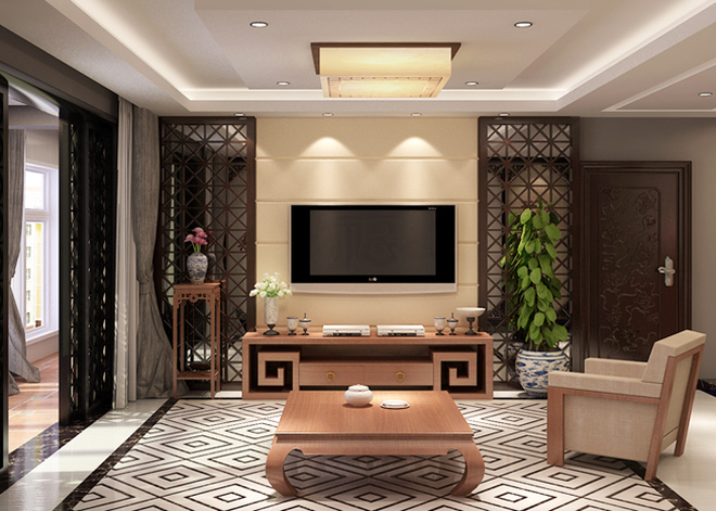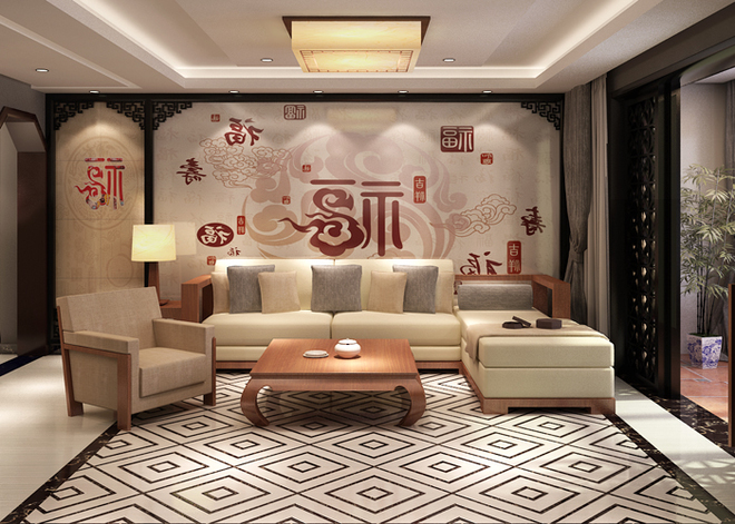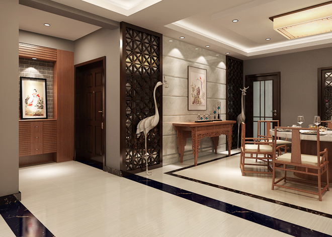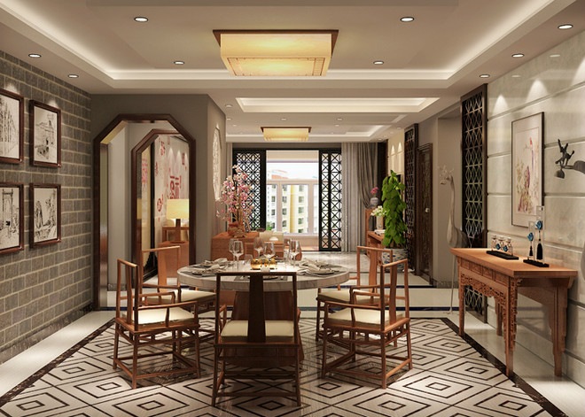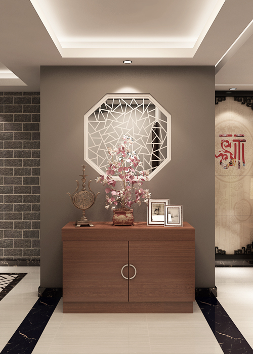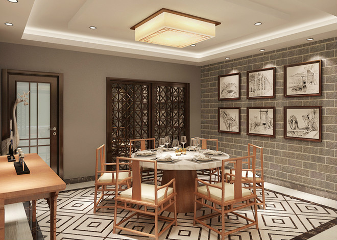 本方案灰色为基调,业主墙体基本使用小青砖壁纸装饰。木雕的几何图案搭配上石料本身的自然纹理组合成图纹。极富装饰效果。在平面布局上规模灵活,变幻无穷;在空间结构和利用上,造型丰富,讲究韵律美。