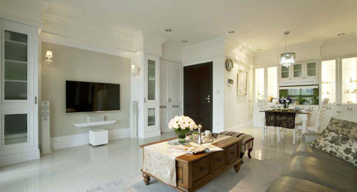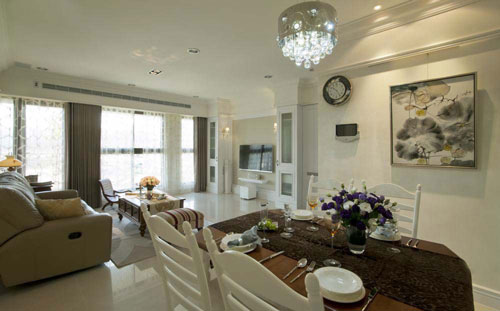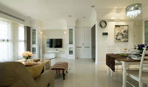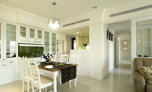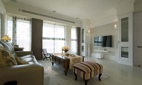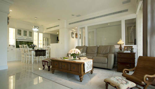 设计理念:设计师根据业主需求,小改动原来房屋格局,把房子改造设计成略带田园感的美式风格美家,线条流畅时尚,简单而富有动感,让空间自然对话,在玄关处则以银丝夹纱玻璃对称框,提点出大户人家气势。