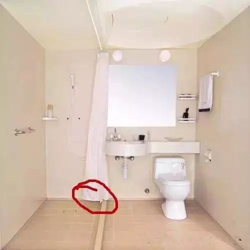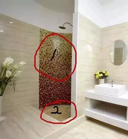 不用淋雨房要用什么,可以采用是石材加浴帘的方式,但要注意的是石材要有一定高度,浴帘要低于石材,洗澡时将浴帘拉到石材里面。上图画红圈处是错误方法,根本起不到挡水的作用。