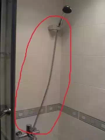 排水管时工人竟将管子从上往下走,结果事后安装花洒支架时便不敢随意打洞了,以此只能把支架装在墙角。倾斜的管子,影响了卫浴间的美观。