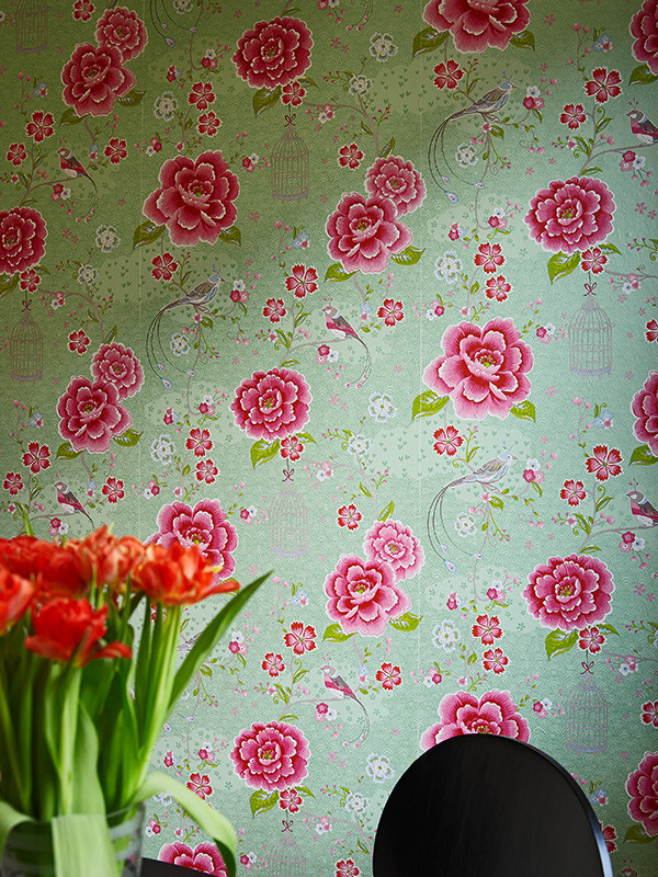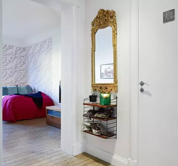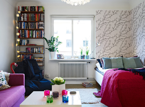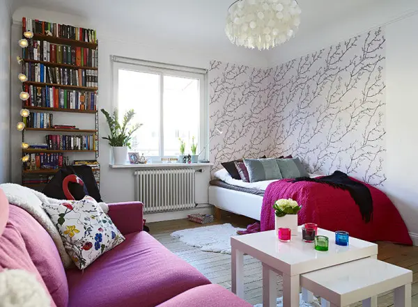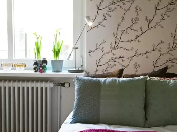 客厅的一个角落还堆放着一张小小的床,而壁纸也是选用的那种线条图案的,正是以树枝作为图案,而窗口摆放的绿植也格外清新起来。