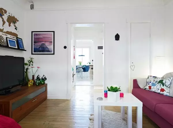 很舒适的沙发,布艺制作,而绘画着花草图案的抱枕则起到了画龙点睛的功效,让人不禁眼前一亮。而客厅虽然狭小,但是却罗列整齐,倒也并不显得拥挤。
